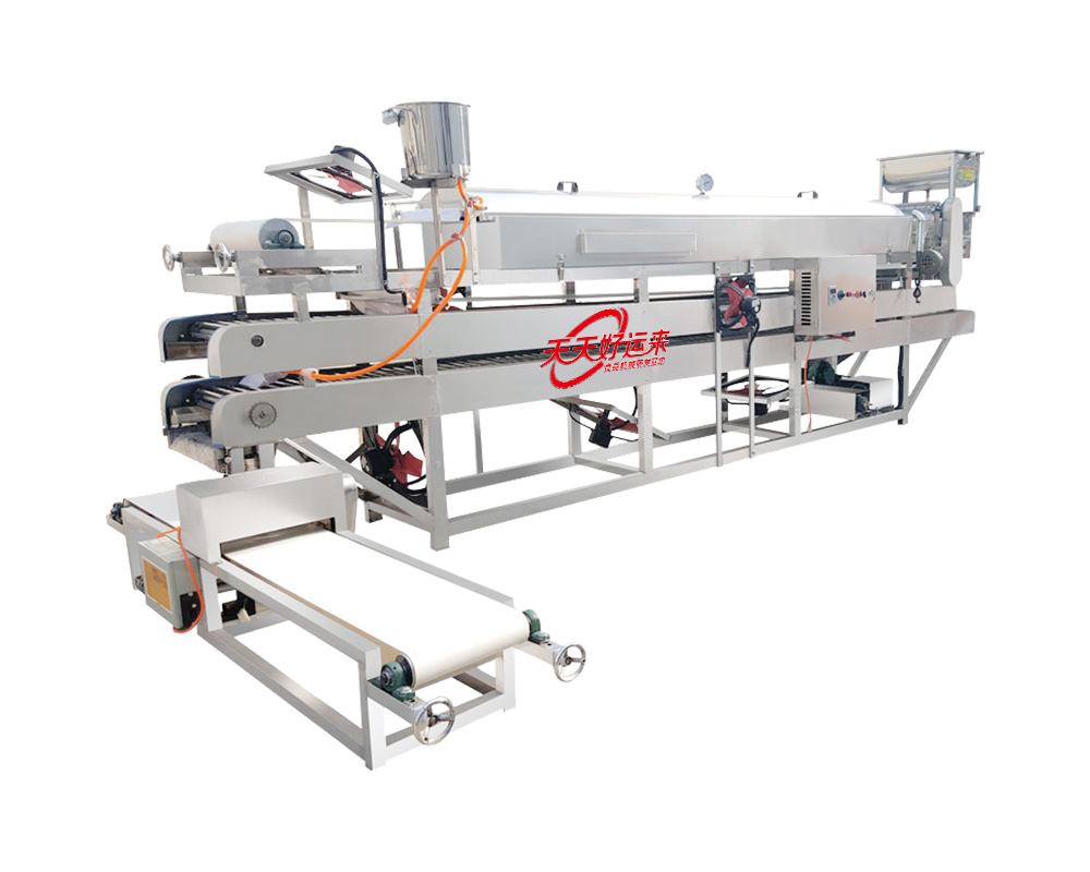 數(shù)控雙層冷卻涼皮機系全自動型,將面漿、米漿、淀粉漿等原料加入漿桶后,可以自動上漿,可生產(chǎn):折疊張、切條等形狀的制品,如涼皮、米皮、河粉、粉皮、米粉、大拉皮等。有時產(chǎn)200-3000斤涼皮(蒸箱長度2-15米)多種型號大小的涼皮機供您選擇。本機機身及箱體采用優(yōu)質(zhì)不銹鋼制造,變頻控制、特氟龍布帶、自動糾偏、自動刷油、雙層傳送冷卻等操作簡便,標配電加熱,機器留有蒸氣管道,可以外接發(fā)蒸汽鍋爐等。機器切斷功能為單選產(chǎn)品,需要另購買。
